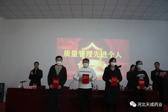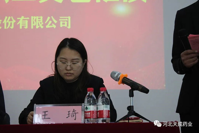 天成藥業(yè)常務(wù)副總經(jīng)理王琦宣讀《對(duì)生產(chǎn)復(fù)方對(duì)乙酰氨基酚片表現(xiàn)突出人員表彰決定》