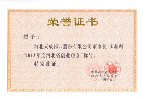 (本報訊 陳媛媛)5月份,河北省民營經濟發展大會在河北會堂召開,會議總結近年來民營經濟發展經驗,部署了未來的工作,對2013年度河北省創業功臣進行表彰。我公司董事長、總經理王振剛獲得“創業功臣”榮譽稱號。